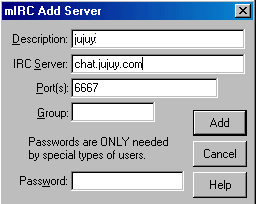 En el Mirc en la primer pantalla que te aparece hace click en el Boton Add, en la ventana que aparecerá en el campo Description: escribí Jujuy ,en el campo IRC Server escribí chat.jujuy.com, luego presiona add y luego en la ventana que aparecerá presiona Connecct to IRC Server !