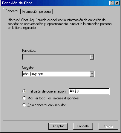 En el Ms chat en la ventana que aparece en el campo servidor escribi chat.jujuy.com, luego clickea en la casilla de ir al salón de conversación : alli escribi #Jujuy , finalmente click en aceptar
